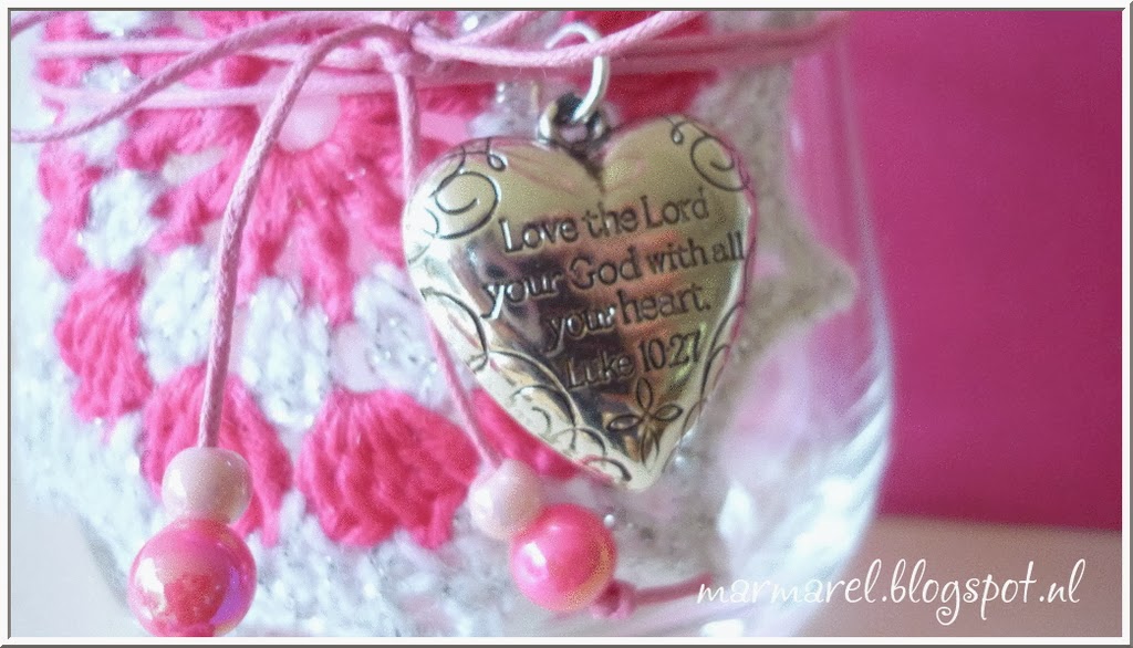 Het idee van een gehaakte doily op een sfeerlicht komt van het blog InHaken, maar dan een roze variant. Ik gebruikte Mod Podge om het vast te plakken.