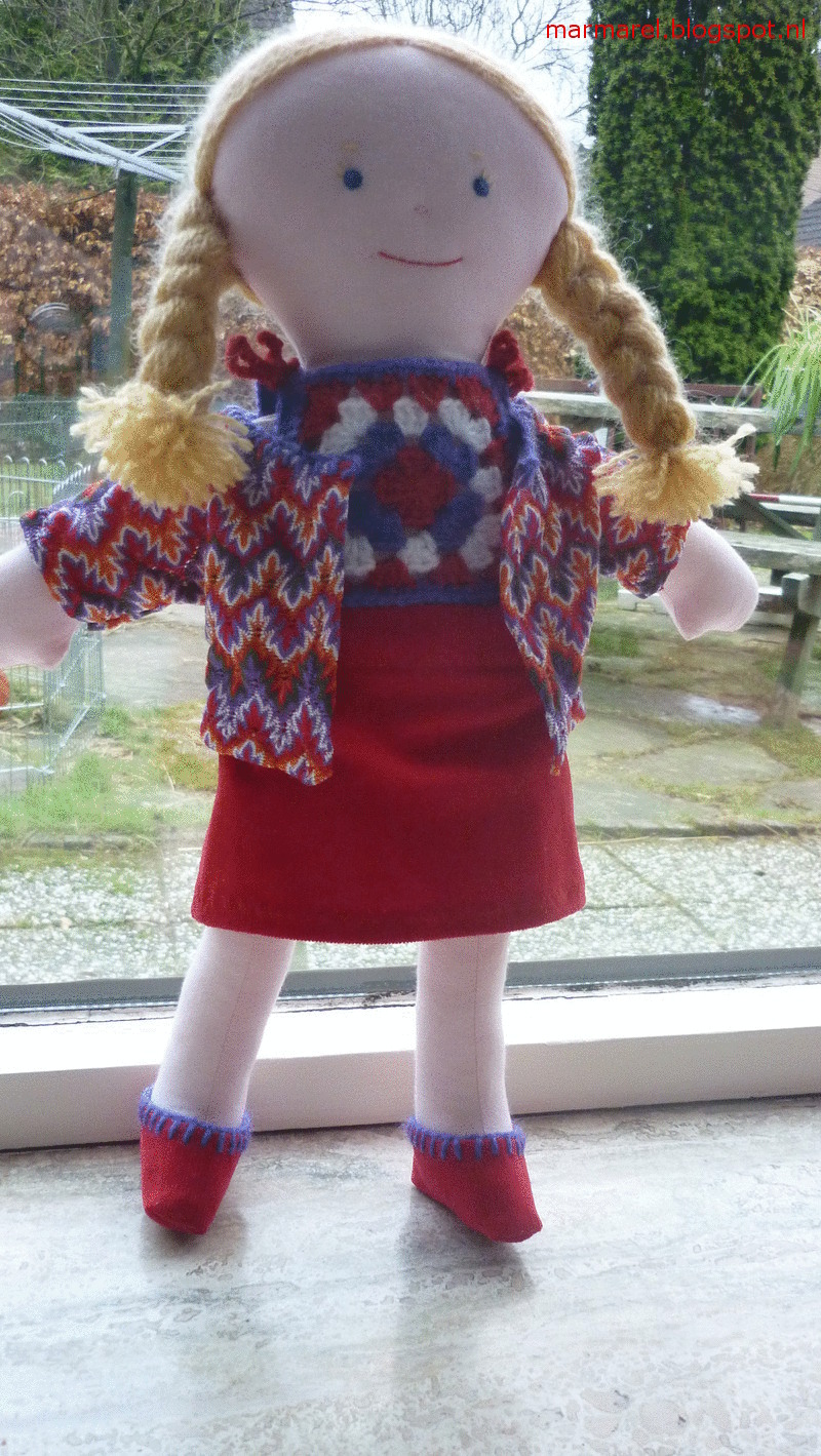 Ik ben een echte 'Tante Hilde-pop', kijk hier maar eens! De mevrouw die mij gemaakt heeft, houdt van haken, dus ik kreeg een gehaakt granny-truitje.